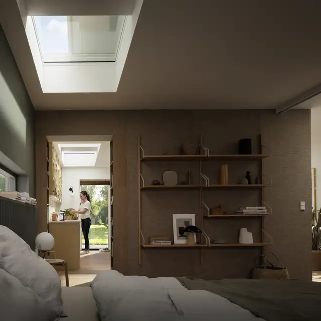 VELUX Blackout Blinds for Glass Rooflights (CVU / CFU) provide complete darkness for New Generation curved and flat glass rooflights. Installed discreetly inside the rooflight, they are designed and manufactured by VELUX to deliver total light control for bedrooms and sleep spaces.