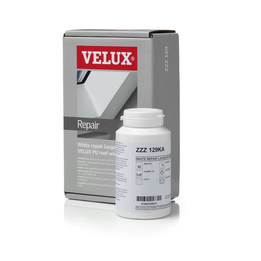 The VELUX ZZZ 129KI Repair Kit is a professional touch-up solution for white polyurethane (maintenance-free) VELUX roof windows. It is specifically developed to repair minor surface damage, stains and superficial scratches on the outer lacquer layer.